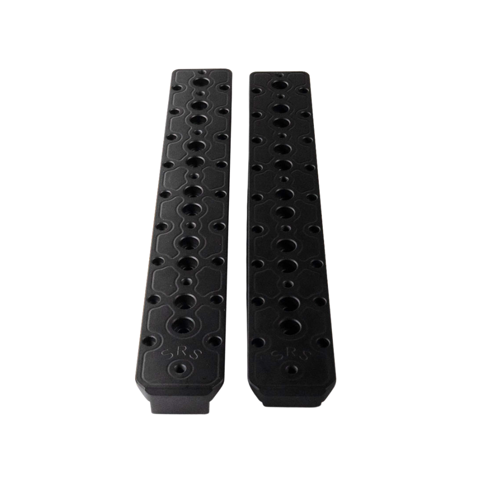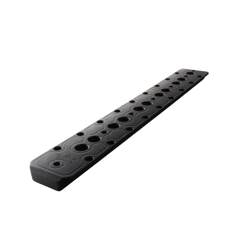 Our new SRS 10″ Steel “Weighted” Arca rail. This rail face has (7) threaded 10-32 holes and includes RRS RLock attachment. Finished in Black Cerakote.